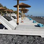 De strandfaciliteiten van het pand in Kamári bevatten ligstoelen en parasols.